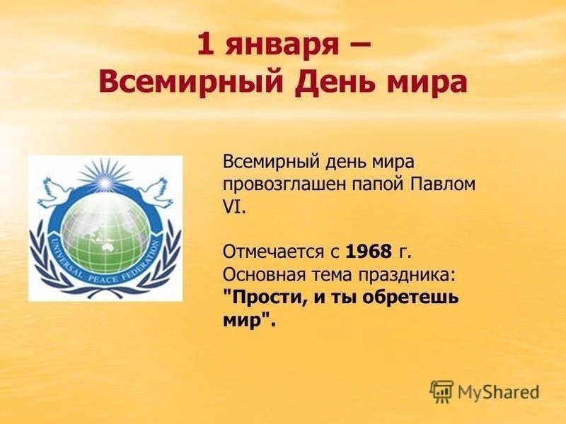 В 1967 году римский папа Павел VI провозгласил Всемирный день мира. У католиков этот праздник называется День всемирных молитв о мире. В течение нескольких лет его отмечали в первый день каждого нового года.