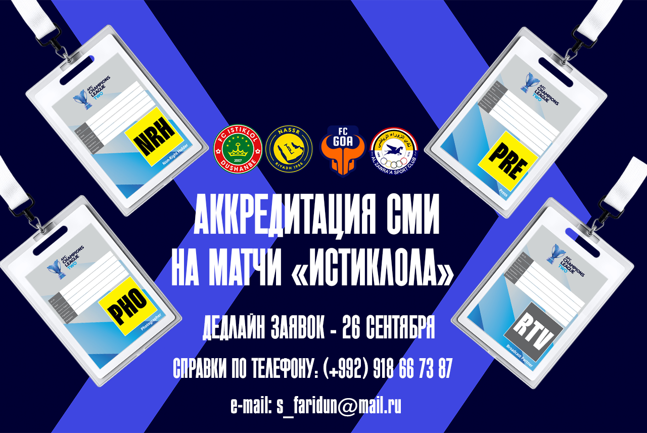 Аккредитационные бейджи будут выданы журналистам 30 сентября за день до матча второго тура группового этапа второй Лиги чемпионов АФК-2025/26 «Истиклол» (Таджикистан) – «Гоа» (Индия).