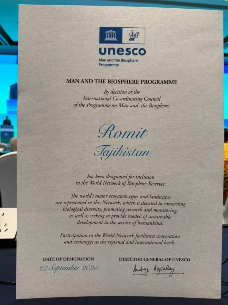 Включение резервата “Ромит” во Всемирную сеть биосферных заповедников отражает приверженность Таджикистана целям устойчивого развития, охраны биологического разнообразия и гармоничного сосуществования человека с природой.