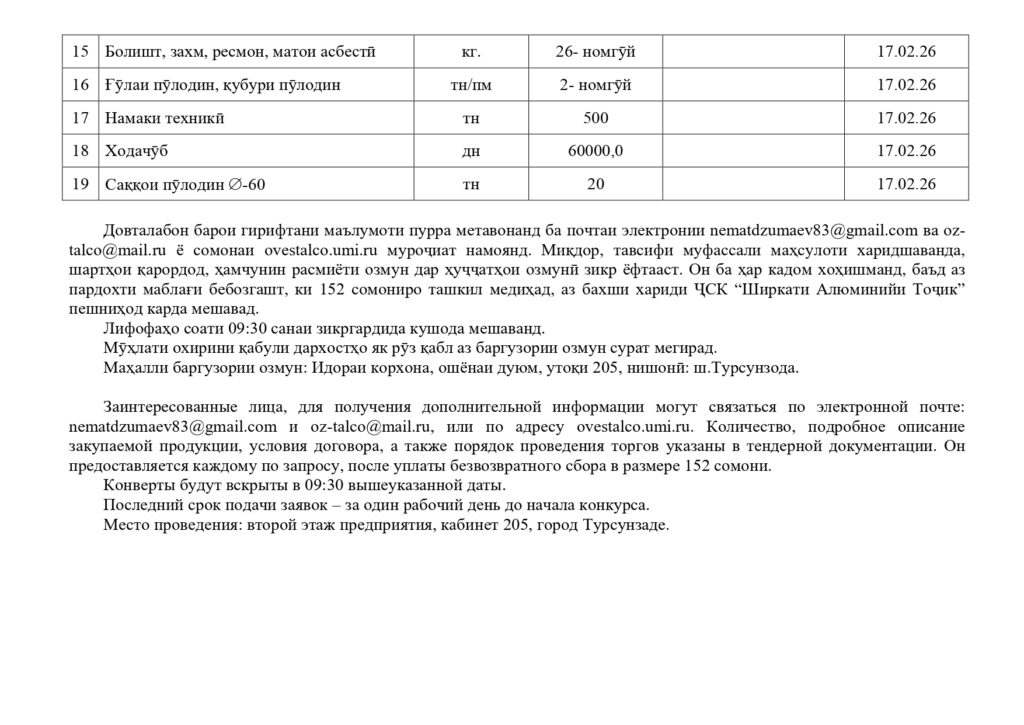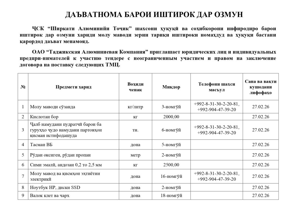 ОАО “Таджикская Алюминиевая Компания” приглашает к участию в тендере на поставку следующих ТМЦ: