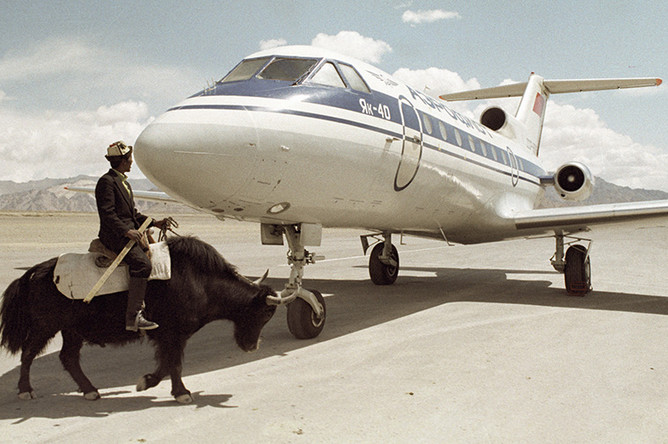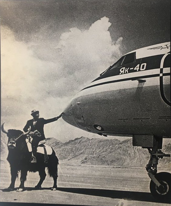Акс: «Вохӯрии ду Як (Як-ба тоҷикӣ маънои қӯтосро дорад)». Сокини Тоҷикистон-савораи қӯтос аз назди ҳавопаймои Як-40 мегузарад, соли 1990.